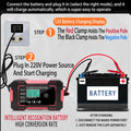A smart charger for car and motorcycle lead-acid batteries (AGM, deep cycle, GEL). Features pulse repair, fast charging, and an LCD display for easy monitoring.
